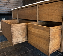 Dette snedker badmøbel har 6 skuffer - 4 mindre skuffer og 2 store. Badmøblet er fremstillet med massive, olierede og fingertappede træskuffer i egetræ med flotte detaljer. Skufferne er lavet med fuldudtræk samt softluk og kommer med vaskeudskæring i øverste skuffe i midten og fuld dybde i den nederste skuffe.