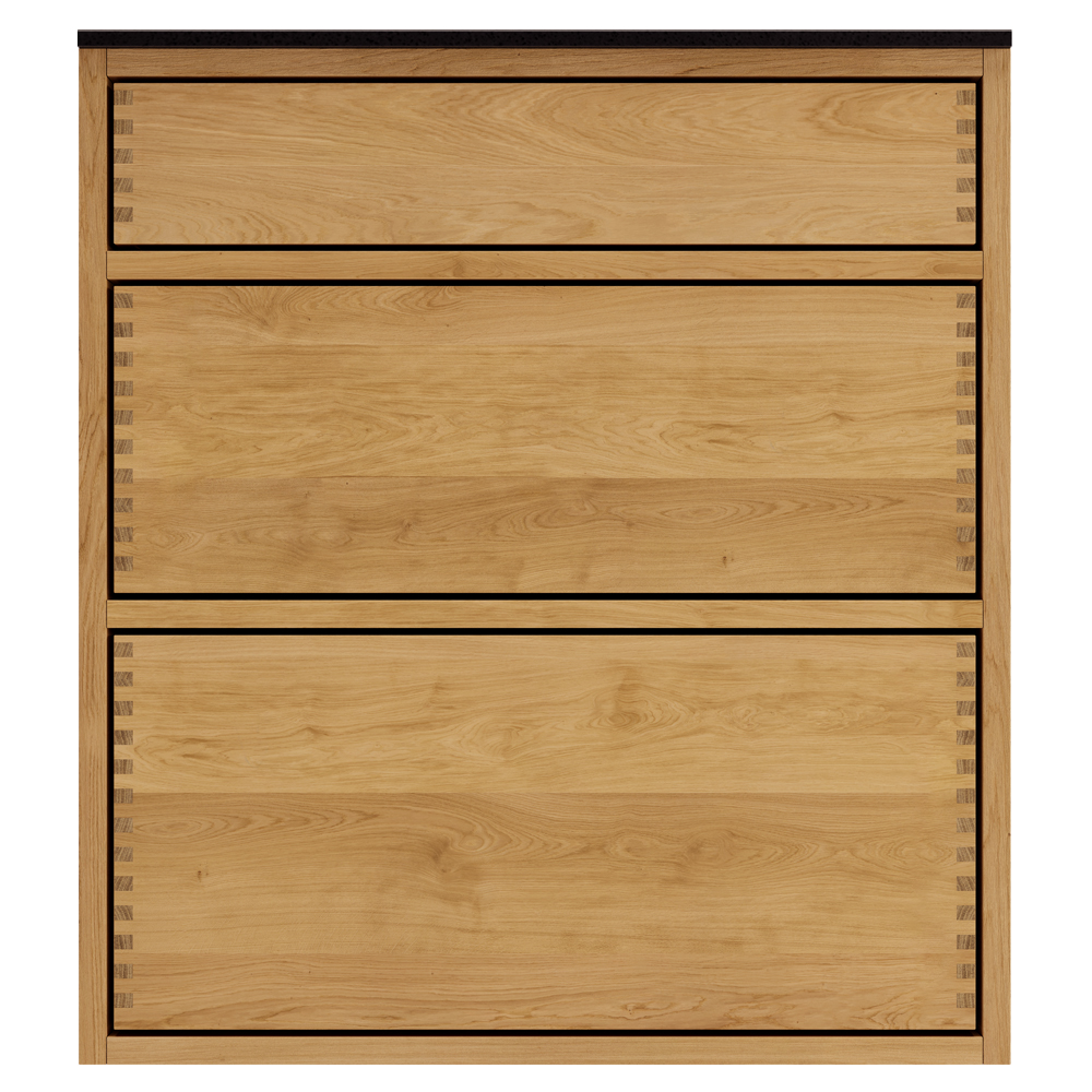 Just Wood Push Snedkerkøkken front til opvaskemaskine bliver fremstillet med en fastmonteret plade bagerst, hvor skuffefronterne fremstilles som i resten af vores underskabe med massive, olierede og fingertappede samlinger i egetræ.