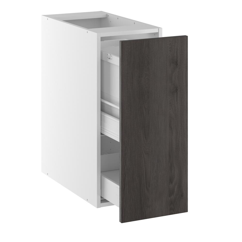 Ergonomisk korrekt affaldsskab/affaldsskuffe, med spande i højde lige under bordpladen. Udtræksskabet kan passes ind i de fleste køkkener, og gør sig bedst tæt på vasken. Skabet er udstyret med to gode spande, en stor og en lille med låg, og der er sågar blevet plads forneden til opbevaring af affaldsposer, opvaskebørsten eller hvad du ellers måtte have lyst til at opbevare nær ved din affaldsskuffe.