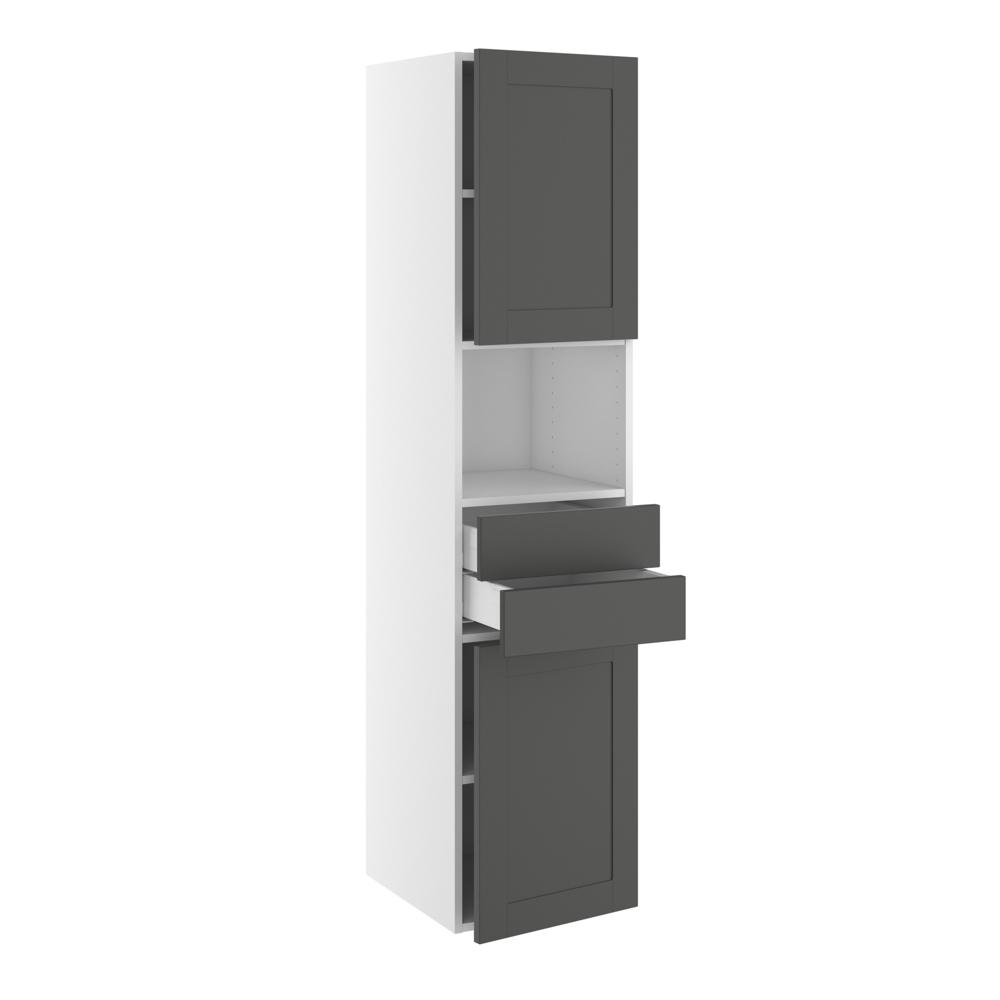 Badhøjskabet, der har en dybde på 45 cm er udstyret med 2 smarte Blum skuffer til alle badeværelsets småting. Skufferne er med fuldudtræk og softclose, hvilket gør at du nemmere kan komme til i skufferne. Skabet er desuden udstyret med 2 låger, samt 2 hylder, hvor du ligeledes får masser af opbevaringsplads. Højskabet kan hænge alene eller sættes sammen med enten et badmiljø eller andre højskabe. Den åbne reol i miden får skabet til at virke lidt lettere, især i små badeværelser. Et smart og praktisk højskab med masser af opbevaringsplads, der egner sig perfekt til badeværelset, og er især velegnet hvor pladsen er trang.