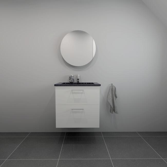 Lækkert badsæt med 2 skuffer, der giver det perfekte overblik i dit badeværelse. Skufferne er med fuldudtræk og softclose, og der er udskæring for afløb i øverste skuffe. Der er mulighed for at tilkøbe eksklusiv skuffeindretning i massiv eg, som giver mulighed for bedre opbevaring af de små dele i badeværelset. Sort Granitex bordplade med en integreret vask, og hanehul.