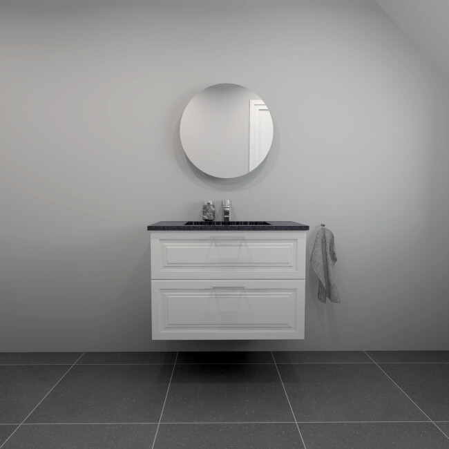 Lækkert badsæt med 2 skuffer, der giver det perfekte overblik i dit badeværelse. Skufferne er med fuldudtræk og softclose, og der er udskæring for afløb i øverste skuffe. Der er mulighed for at tilkøbe eksklusiv skuffeindretning i massiv eg, som giver mulighed for bedre opbevaring af de små dele i badeværelset. Sort Granitex bordplade med en integreret vask, og hanehul.