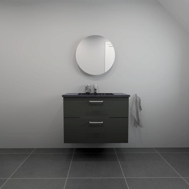 Lækkert badsæt med 2 skuffer, der giver det perfekte overblik i dit badeværelse. Skufferne er med fuldudtræk og softclose, og der er udskæring for afløb i øverste skuffe. Der er mulighed for at tilkøbe eksklusiv skuffeindretning i massiv eg, som giver mulighed for bedre opbevaring af de små dele i badeværelset. Sort Granitex bordplade med en integreret vask, og hanehul.