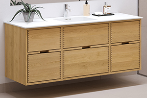Badmøblet måler 62 cm i bredde. 57 cm i højde. Dybden er 45 cm uden fronter. Der er udskæring i den øverste skuffe til afløb fra vasken, og naturligvis fuld udtræk og softluk i skufferne.