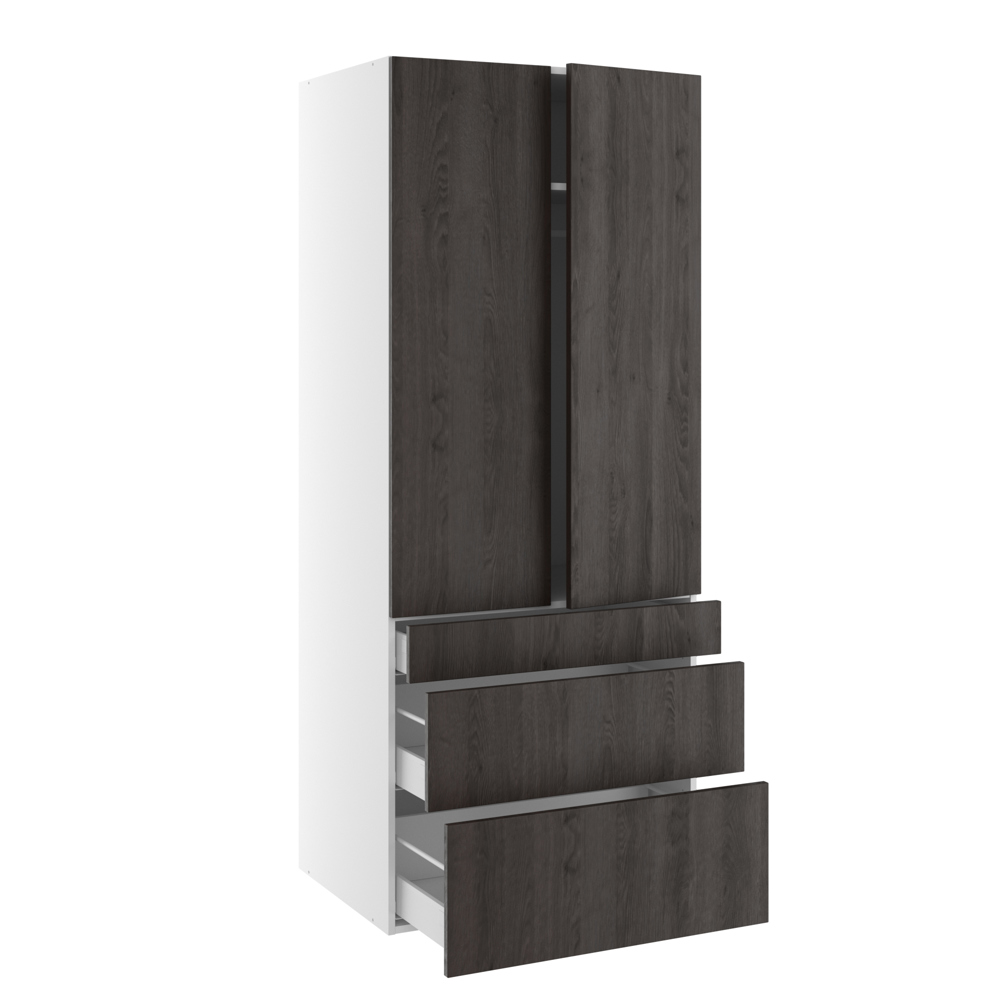 Smart og praktisk indrettet bredt garderobeskab med en let tilgængelighed. Højskabet rummer både bøjlestang, hylde og hele 3 skuffer af forskellig højde, så du kan have plads til opbevaring af både store og små sager. Bøjlestangen holder skjorter og bluser i en perfekt højde, og skabet kan bruges alene eller i sammenhæng med andre højskabe. Overvej at tilkøbe dæmpere til hængslerne, så ingen får klemte fingre.