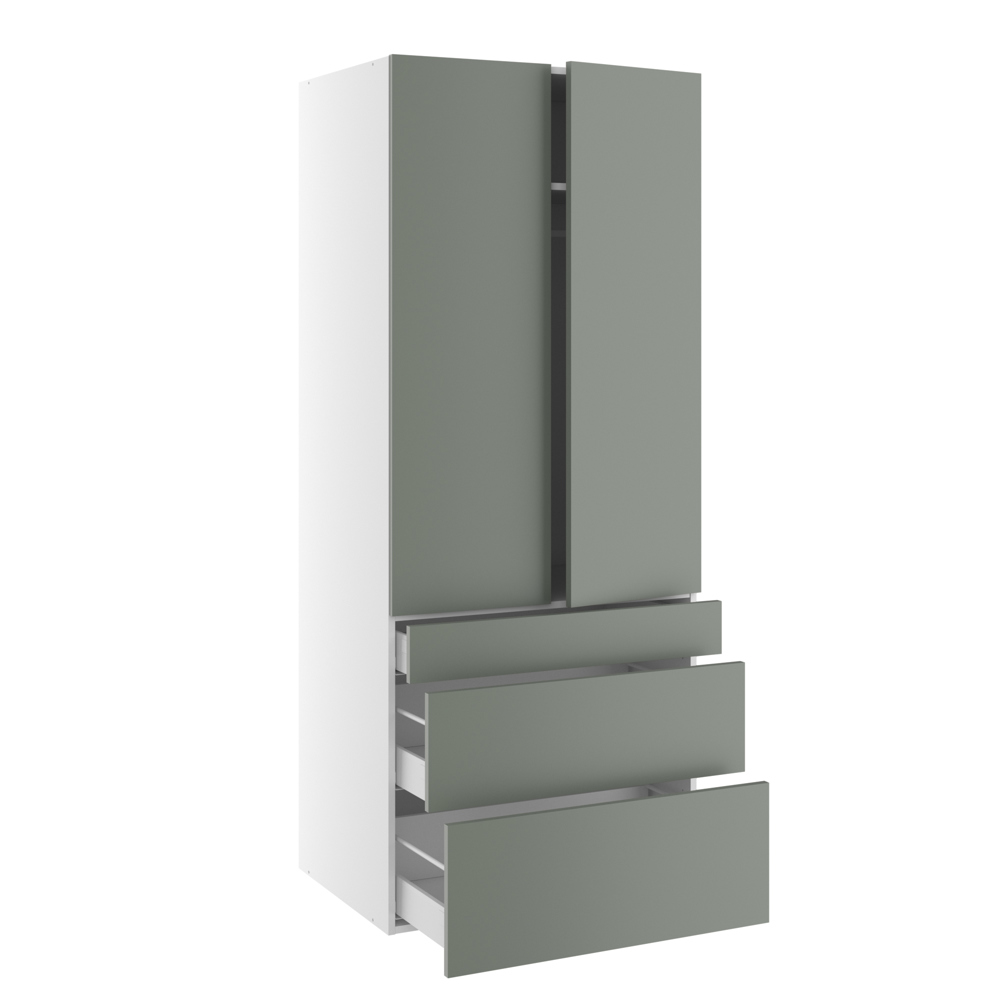 Smart og praktisk indrettet bredt garderobeskab med en let tilgængelighed. Højskabet rummer både bøjlestang, hylde og hele 3 skuffer af forskellig højde, så du kan have plads til opbevaring af både store og små sager. Bøjlestangen holder skjorter og bluser i en perfekt højde, og skabet kan bruges alene eller i sammenhæng med andre højskabe. Overvej at tilkøbe dæmpere til hængslerne, så ingen får klemte fingre.