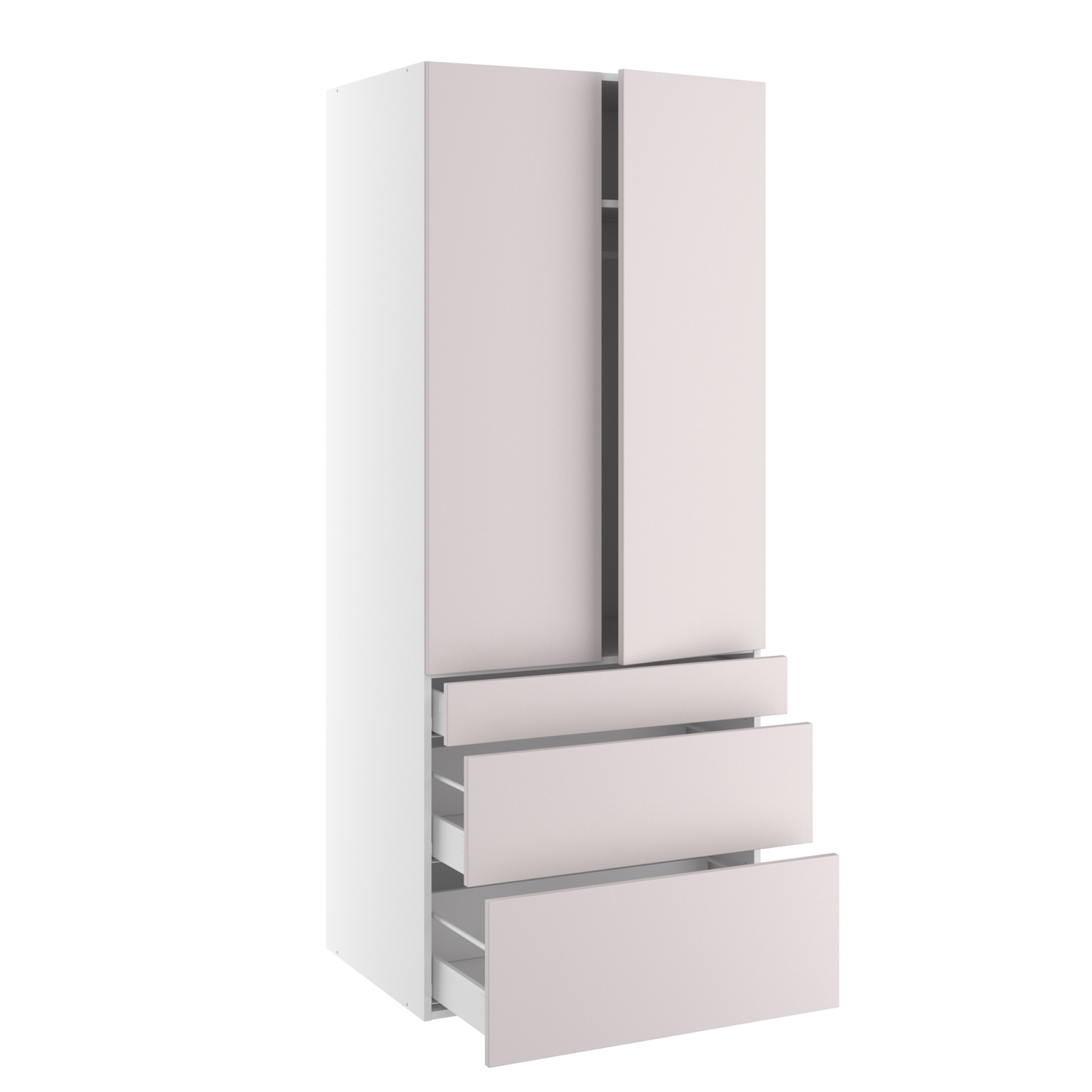 Smart og praktisk indrettet bredt garderobeskab med en let tilgængelighed. Højskabet rummer både bøjlestang, hylde og hele 3 skuffer af forskellig højde, så du kan have plads til opbevaring af både store og små sager. Bøjlestangen holder skjorter og bluser i en perfekt højde, og skabet kan bruges alene eller i sammenhæng med andre højskabe. Overvej at tilkøbe dæmpere til hængslerne, så ingen får klemte fingre.