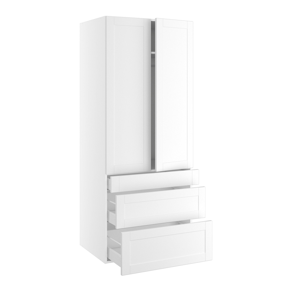 Smart og praktisk indrettet bredt garderobeskab med en let tilgængelighed. Højskabet rummer både bøjlestang, hylde og hele 3 skuffer af forskellig højde, så du kan have plads til opbevaring af både store og små sager. Bøjlestangen holder skjorter og bluser i en perfekt højde, og skabet kan bruges alene eller i sammenhæng med andre højskabe. Overvej at tilkøbe dæmpere til hængslerne, så ingen får klemte fingre.