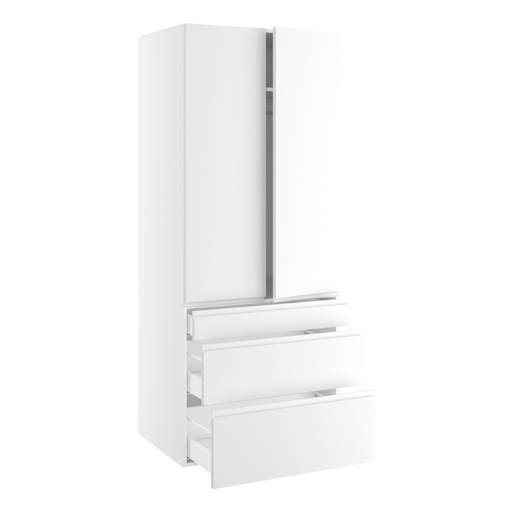 Smart og praktisk indrettet bredt garderobeskab med en let tilgængelighed. Højskabet rummer både bøjlestang, hylde og hele 3 skuffer af forskellig højde, så du kan have plads til opbevaring af både store og små sager. Bøjlestangen holder skjorter og bluser i en perfekt højde, og skabet kan bruges alene eller i sammenhæng med andre højskabe. Overvej at tilkøbe dæmpere til hængslerne, så ingen får klemte fingre.