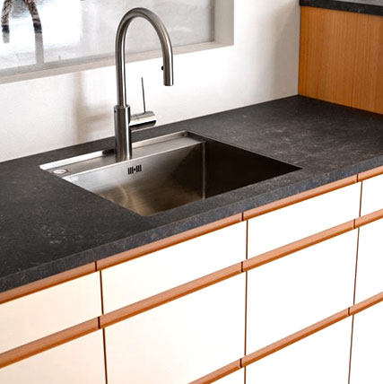 Daglig brug Du finder ganske enkelt ikke et mere rengøringsvenligt og vedligeholdelsesfrit materiale end laminat. Den daglige aftørring klares nemt med en blød karklud opvredet i varmt vand uden rengøringsmidler. Laminaten er samtidig særdeles stærk og tåler derfor uden problemer en hektisk dagligdag med utallige små slag og stød. Vi anbefaler altid, at du bruger afsætningsrist eller bordskåner til dine varme gryder og pander. Også selvom laminaten tåler kortvarig kontakt med op til 110° varme genstande. Designdetaljer Det store udvalg af laminater giver dig nærmest ubegrænsede muligheder for at få præcis den bordplade, du ønsker. Du kan også skabe kreative og funktionelle løsninger ved at kombinere din laminatbordplade med en bordplade i et andet materiale, fx stål eller natursten. Lad din køkkenforhandler hjælpe dig med at slippe kreativiteten fri og finde den helt rigtige kombination af bordplade og kant. Farver og strukturer Under det øverste lag klare melamin finder du det dekorpapir, der giver laminatpladen dens farve og eventuelle mønster. Vi har op mod 80 varianter i sortimentet, både ensfarvede og dekorerede, der giver dig mulighed for at vælge din bordplade med et særdeles naturtro look af forskellige træsorter, marmor og andre stenvarianter. Du kan også vælge fra vores spændende udvalg af printede designs. Og vil du have din laminatplade med et særlig eksklusivt udtryk, tilbyder vi supermatte laminater, hvor nanoteknologi forhindrer generende genskin ogsynlige aftryk fra fedtede fingre. Varme Laminat er varmetolerant og tåler op til 110°, dog kun kortvarigt. Benyt altid afsætningsmuligheder i form af afsætningsriste, bordskånere eller lignende, idet gryder o.l. let overstiger varmegrænsen, hvorved overfladen beskadiges for bestandigt. . Vi har hos Kitchn.dk et bredt sortiment af laminatbordplader, herunder flere forskellige farver samt flere forskellige tykkelser. Materialebeskrivelse Laminatbordplader er produceret af sammenpresset papirmateriale. Alle de bordplader, som vi forhandler, er udelukkende produceret af kvalitetslaminater, som limes på en spånplade. Vi tilbyder bordpladerne i flere forskellige tykkelser, herunder en tykkelse på 0,8mm, 0,9mm samt 1,2mm. Vaske Vasken underlimes direkte under laminaten. Limningen er så stærk, at vasken kan modstå et samlet tryk på over 150 kg Bemærk: - Specielt ved mørke, blanke og ensfarvede laminater kan flangen give spejlrefleks i laminaten.