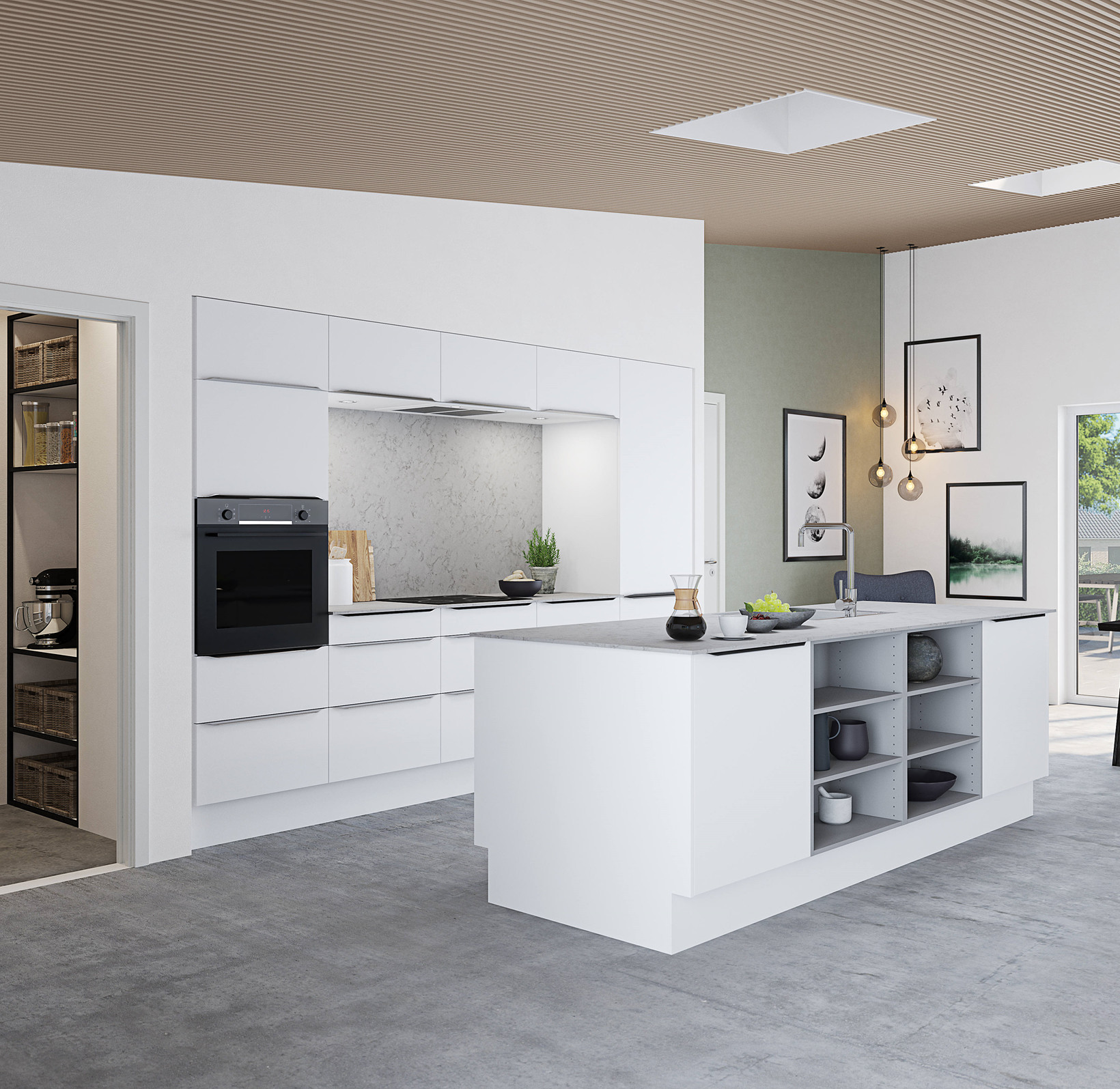 Selvom køkkenet har en fin størrelse til den gennemsnitlige families størrelse, er der her lavet et super funktionelt viktualierum med en skydedør som indgang, Skydedøren faider pænt ind i de hvide overflader og fylder minimalt ud i rummet. Viktualierummet giver mulighed for at opbevare køkkenmaskiner, ekstra service, madvarer og andet som ikke anvendes hverdag i køkkenet, men som er rart at have i nærheden