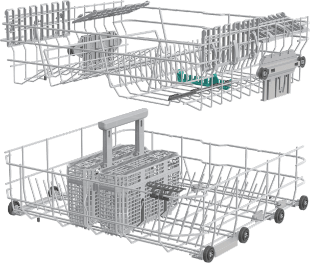 Nederste kurv består afTrådkurv med brede mellemrum Fældbar og delelig tallerkenrække bagerst Bestikkurv