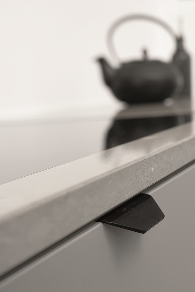 Design, innovation og forbedring af et "profilgreb" er yderst berigende, og selvfølgelig også en udfordring, fordi lågen normalt skjuler hele grebets overflade med ca 90 %. I dette tilfælde har vi skubbet på, til vi nåede det absolut bedste resultat i en definition af "less is more". Blaze er grundlæggende delt i to dele, en skjult del og en synlig del. Den synlige del er ekstrem lineær og nordisk, men der anes et svagt træk, en smal fure mellem det øverste og den skæve overflade, der tillader, at lyset fanges, når der tages fat i grebet