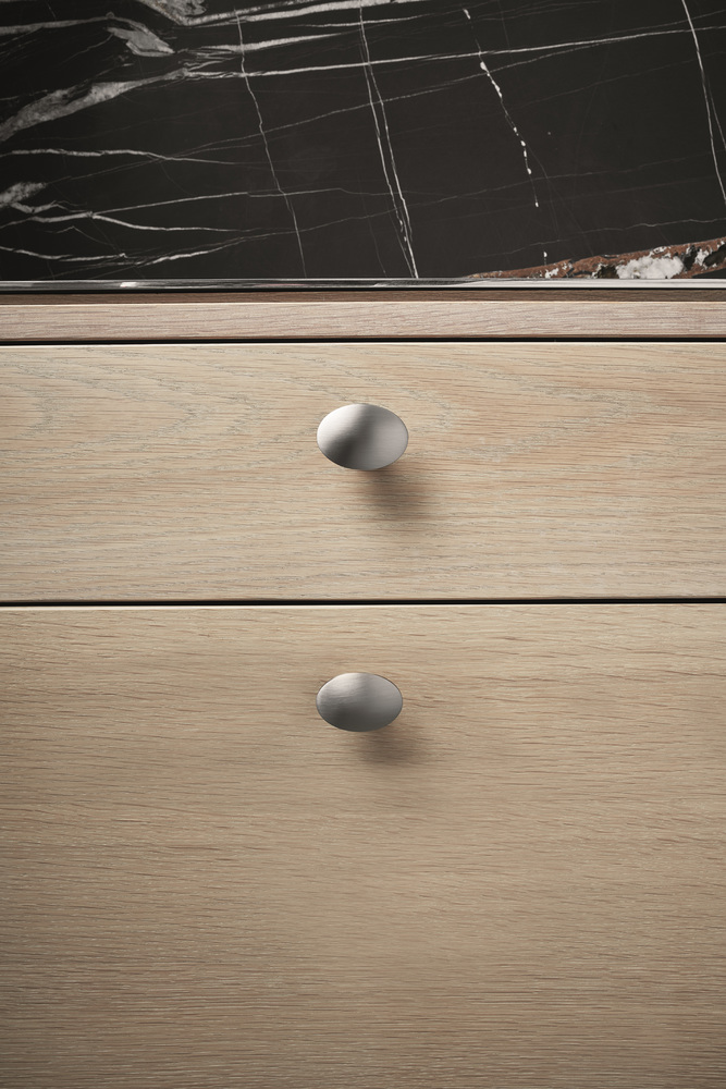 Furnipart - Dome grebet er inspireret af den ovale form. Når den ovale form roterer rundt om sin egen akse, bliver den som en afrundet og stram enhed - som et æg. Furnipart ønskede at lade den bløde ovale og den stramme to-dimensioneelle facon møde hinanden. Grebet er blødt og indbydende set forfra, og man kan se det tynde omrids af den ovale facon på bagsiden af grebet. Det er et møde mellem naturens bløde former og de skarpe geometriske former.