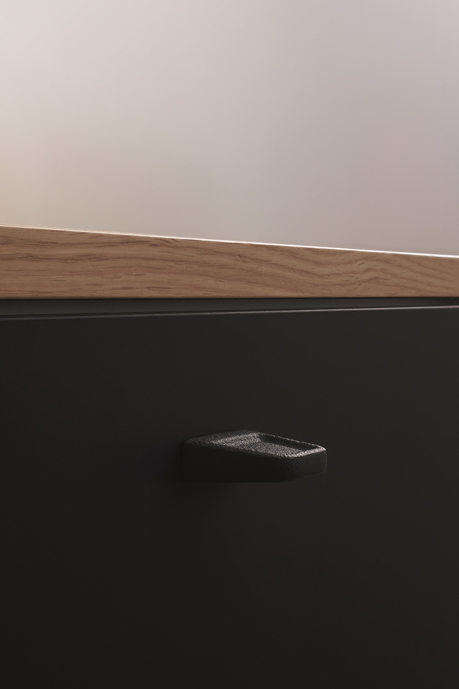 Udtrykket af både et håndtag og en knop blev bestemt af materialet. Jeg tænker på, hvilken produktionsmetode designet skal gennemgå i min søgning efter det rigtige design. Støbejern rummer nogle meget interessante muligheder, som jeg ønskede at udforske. Jeg har fundet inspiration i værktøj, gamle maskiner og godt håndværk, og resultatet er et håndtag og en knop, der synes næsten arkitektonisk. De hænger tydeligt sammen, men kan også nemt bruges hver for sig.