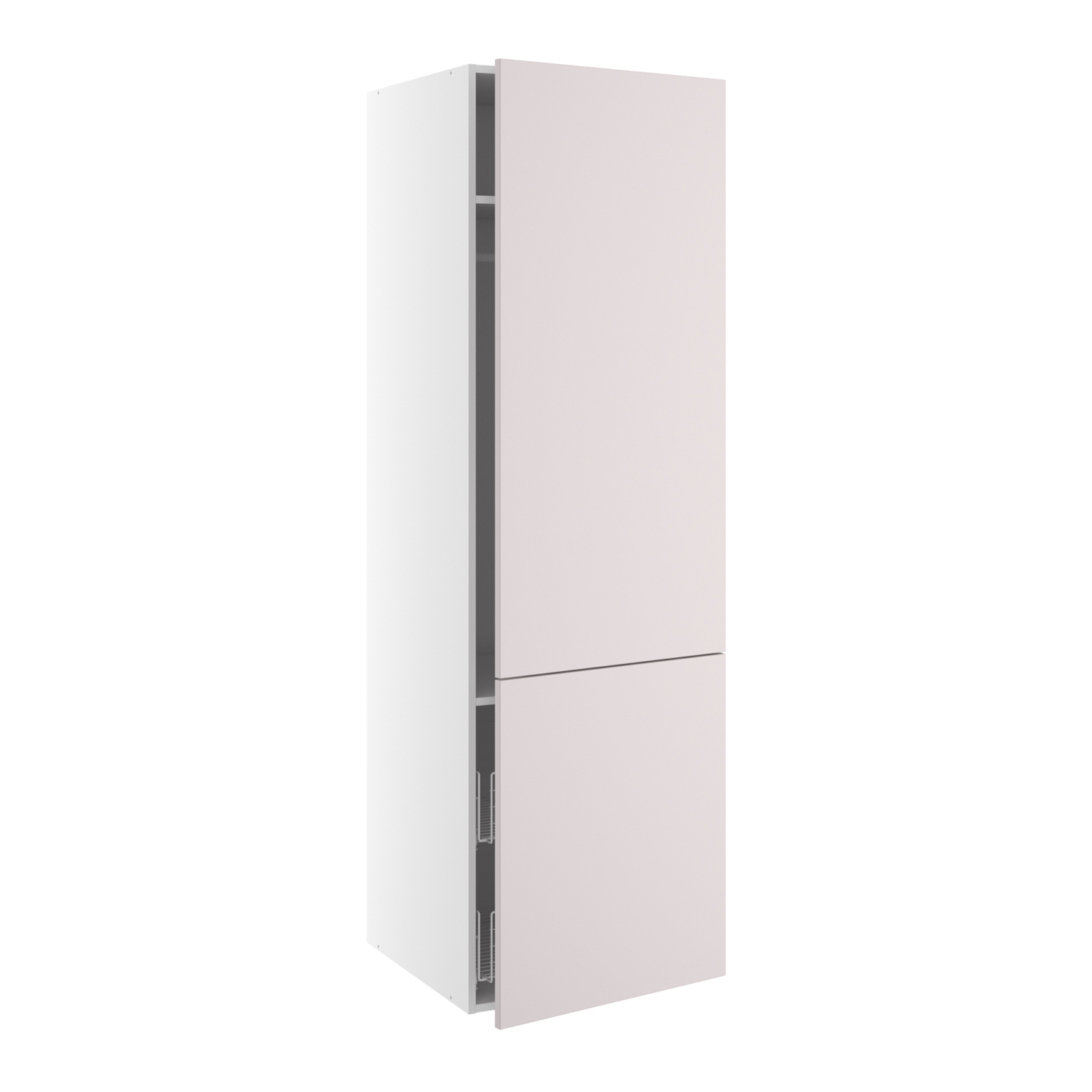 Praktisk indrettet højskab med let tilgængelighed, ikke mindst pga. de opdelte låger. De smarte trådkurve i bunden af skabet gør det let at udnytte den nederste del af skabet, og bøjlestangen midtfor holder skjorter og bluser i en perfekt højde. De to hylder kan endvidere placeres i skabet, hvor man ønsker det, og udnytter den resterende plads i skabet bedst muligt. Skabet kan bruges alene eller i en sammenhæng med andre højskabe. Overvej dæmpere på hængslerne, så der ikke er nogen der får klemte fingre bag lågerne.