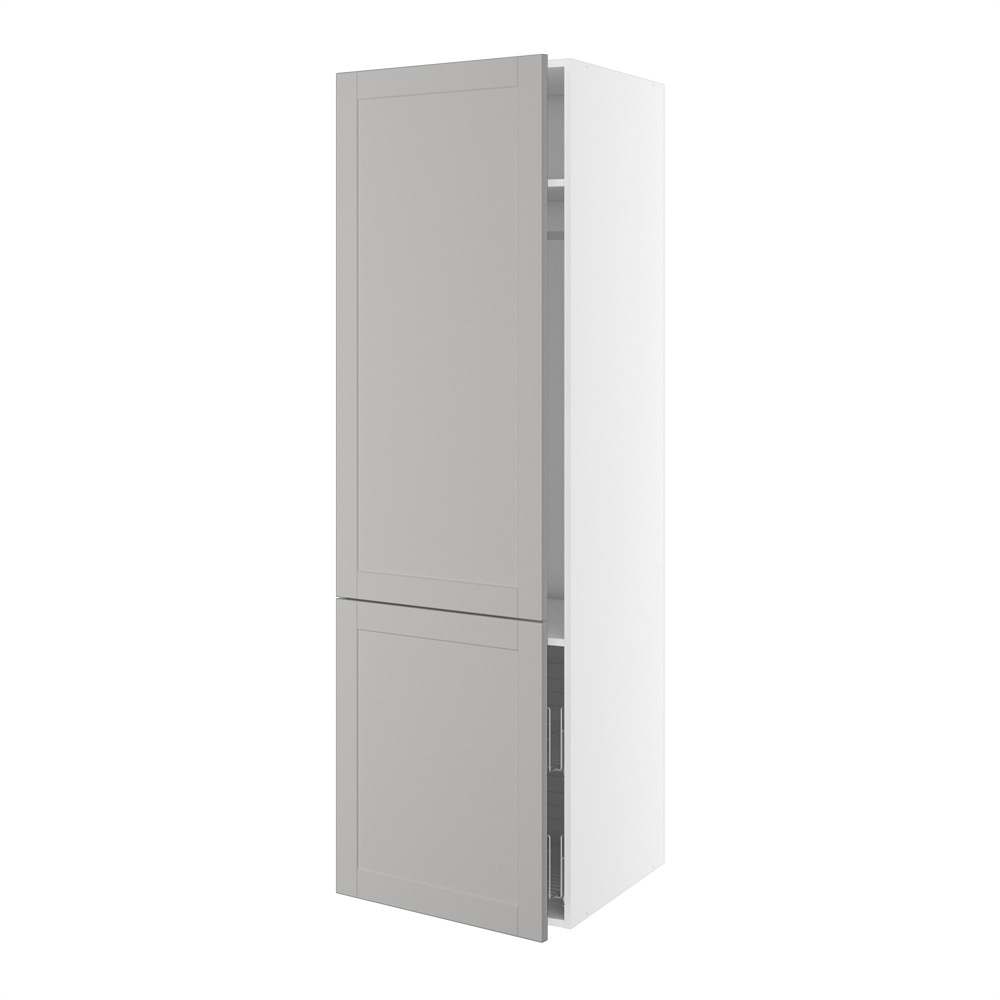 Praktisk indrettet højskab med let tilgængelighed, ikke mindst pga. de opdelte låger. De smarte trådkurve i bunden af skabet gør det let at udnytte den nederste del af skabet, og bøjlestangen midtfor holder skjorter og bluser i en perfekt højde. De to hylder kan endvidere placeres i skabet, hvor man ønsker det, og udnytter den resterende plads i skabet bedst muligt. Skabet kan bruges alene eller i en sammenhæng med andre højskabe. Overvej dæmpere på hængslerne, så der ikke er nogen der får klemte fingre bag lågerne.
