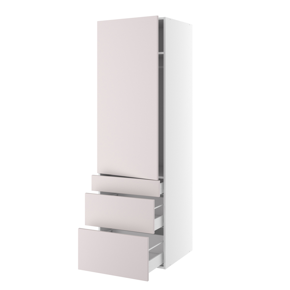 Smart og praktisk indrettet garderobeskab med en let tilgængelighed. Højskabet rummer både bøjlestang, hylde og hele 3 skuffer af forskellig højde, så du kan have plads til opbevaring af både store og små sager. Bøjlestangen holder skjorter og bluser i en perfekt højde, og skabet kan bruges alene eller i sammenhæng med andre højskabe. Overvej at tilkøbe dæmpere til hængslerne, så ingen får klemte fingre.