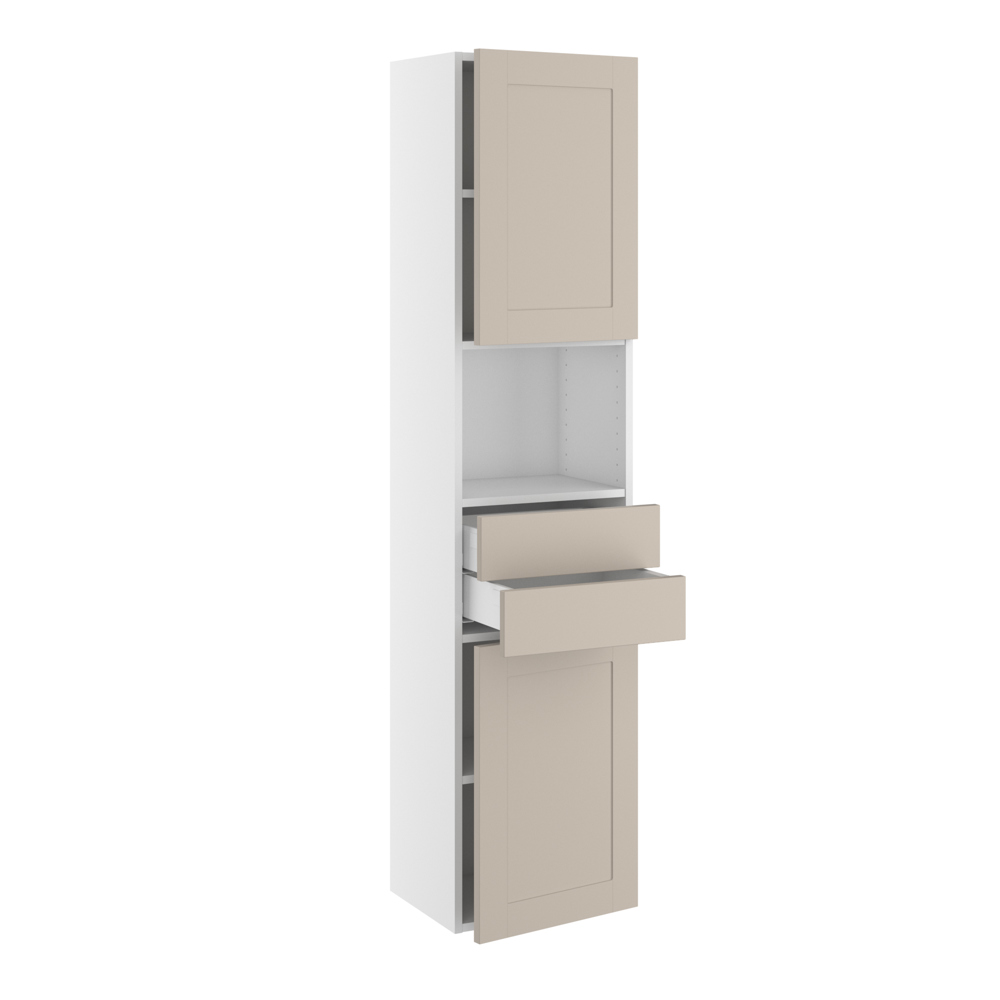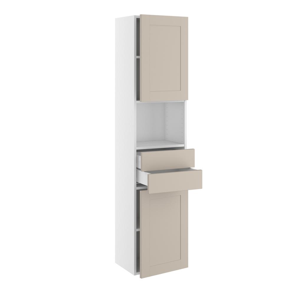 Badhøjskab i model slimline til badeværelser, hvor pladsen er afgørende. Dybden på kun 32 cm gør det nemt at få plads til højskabet. Bemærk de smarte skuffer til alle badeværelsets småting. Skufferne er med fuldudtræk og softclose, hvilket gør at du nemmere kan komme til i skufferne. Skabet er desuden udstyret med 2 låger, samt hylder, hvor du ligeledes får masser af opbevaringsplads. Skabet kan hænge alene eller sættes sammen med enten et badmiljø eller andre højskabe. Den åbne reol i miden får skabet til at virke lidt lettere, især i små badeværelser. Et smart og praktisk højskab med masser af opbevaringsplads, der egner sig perfekt til badeværelset, og er især velegnet hvor pladsen er trang.