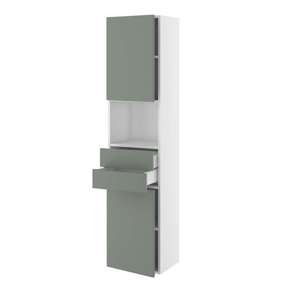 Badhøjskab i model slimline til badeværelser, hvor pladsen er afgørende. Dybden på kun 32 cm gør det nemt at få plads til højskabet. Bemærk de smarte skuffer til alle badeværelsets småting. Skufferne er med fuldudtræk og softclose, hvilket gør at du nemmere kan komme til i skufferne. Skabet er desuden udstyret med 2 låger, samt hylder, hvor du ligeledes får masser af opbevaringsplads. Skabet kan hænge alene eller sættes sammen med enten et badmiljø eller andre højskabe. Den åbne reol i miden får skabet til at virke lidt lettere, især i små badeværelser. Et smart og praktisk højskab med masser af opbevaringsplads, der egner sig perfekt til badeværelset, og er især velegnet hvor pladsen er trang.