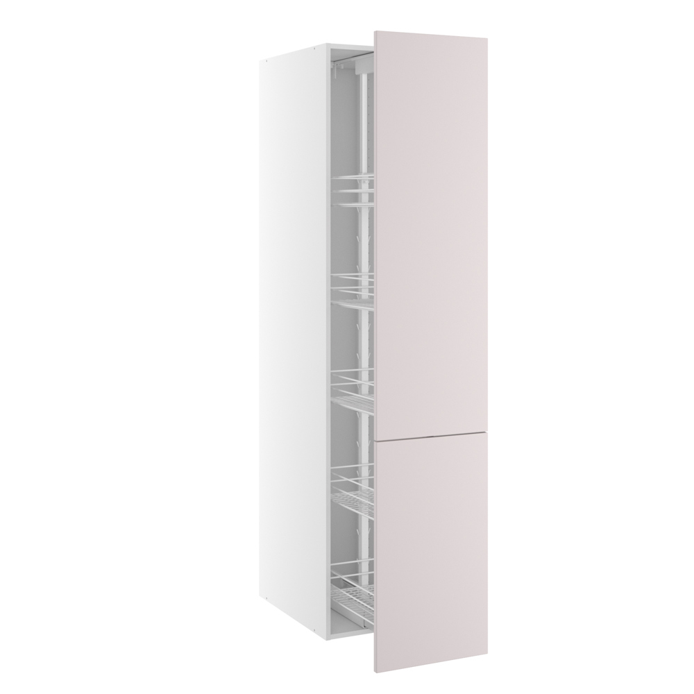 Fleksibelt, smalt højskab, der er god til opbevaring. Det smarte udtrækssystem, sikrer tilgængelighed fra flere sider, da de 5 stk. indbyggede kurve følger med lågen ud, når skabet åbnes. Køkkenskabet er desuden let at åbne, selv ved stor belastning. Skabet har et væld af anvendelsesmuligheder. Brug skabet som et opbevaringsskab eller kolonialskab i køkkenet, hvor du kan opbevare alt fra mel og gryn til service og køkkengrej.