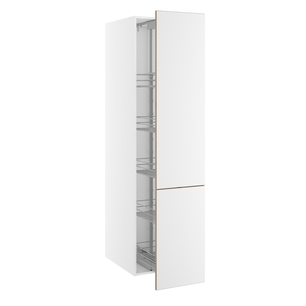 Fleksibelt, smalt højskab, der er god til opbevaring. Det smarte udtrækssystem, sikrer tilgængelighed fra flere sider, da de 5 stk. indbyggede kurve følger med lågen ud, når skabet åbnes. Køkkenskabet er desuden let at åbne, selv ved stor belastning. Skabet har et væld af anvendelsesmuligheder. Brug skabet som et opbevaringsskab eller kolonialskab i køkkenet, hvor du kan opbevare alt fra mel og gryn til service og køkkengrej.