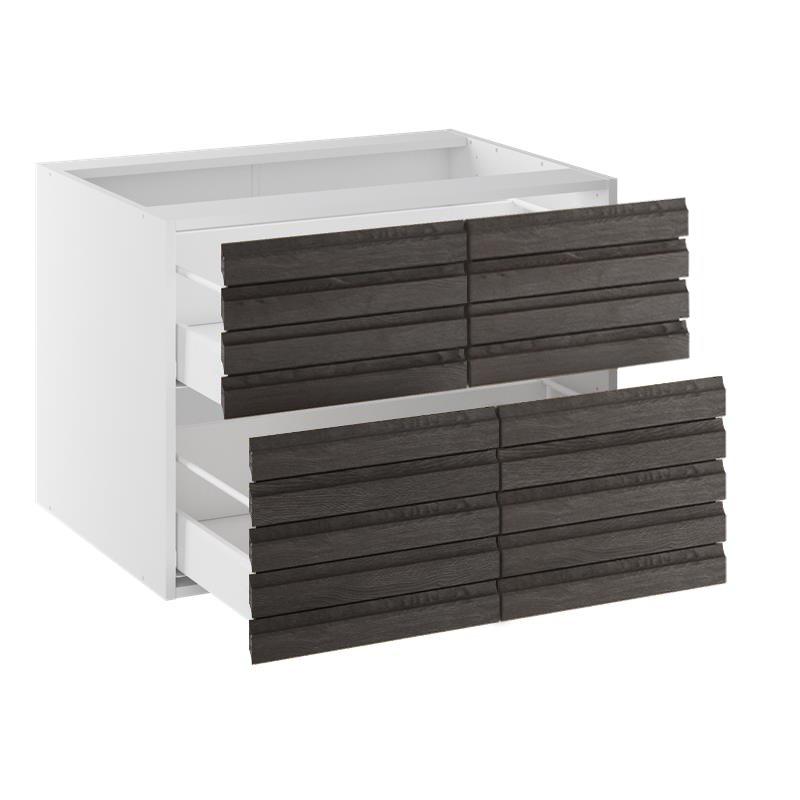 Elegant vaskeskab, der er udstyret med superstærke luksusskuffer, der tåler daglig brug og kan belastes op til 30kg. pr. skuffe. Skufferne har fuld udtræk og er med softclose, så du undgår smæklyden, når de lukkes. Anvend underskabet som en del af et badmiljø. Skabet er kendetegnet ved de smukke linjer som stavene i massiv ædeltræ giver, når man monterer en række skabe sammen. Et smart og praktisk underskab med masser af opbevaringsplads, der især egner sig perfekt til de mindre badeværelser, hvor pladsen er trang.