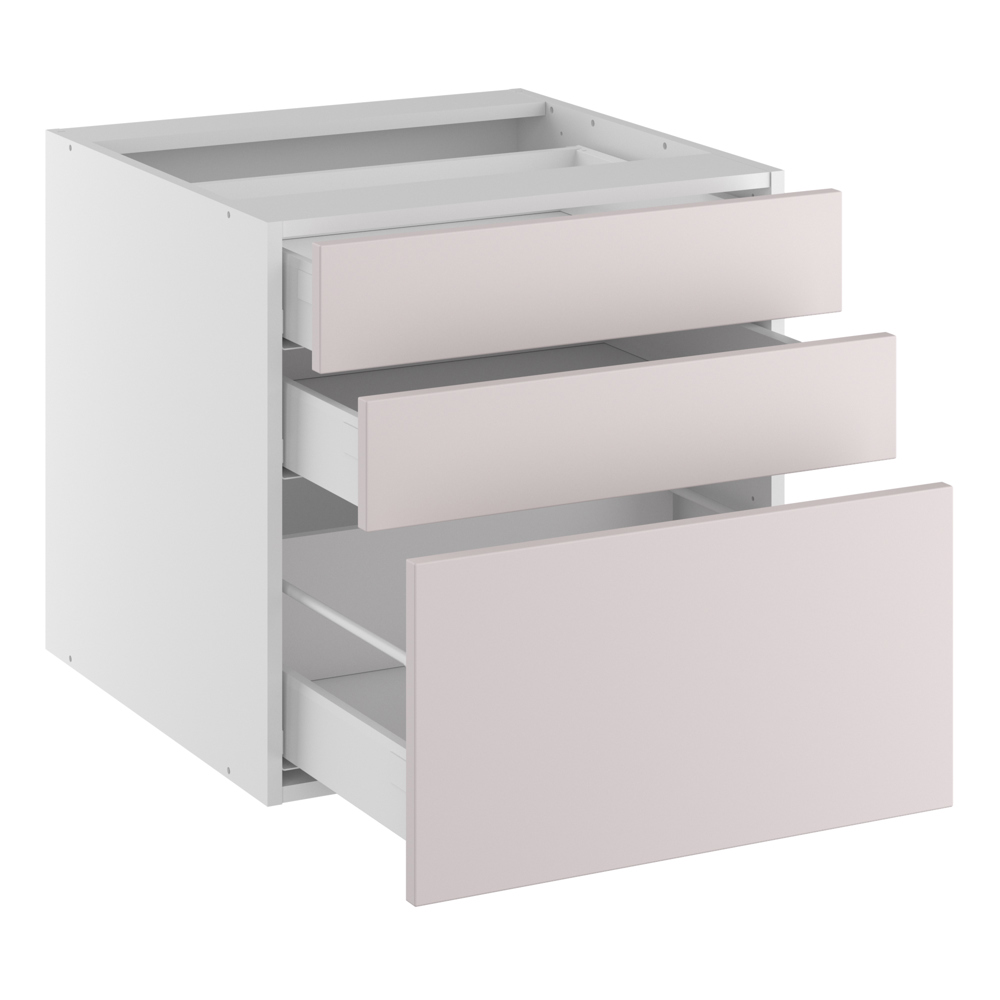 Lavt skuffeskab med 3 anvendelige skuffer. Plads til alle de småting du måtte have brug for at opbevare. Underskabet er udstyret med vores gode skuffer, der bærer helt op til 30 kg. pr. skuffe, og der er både fuldudtræk og softluk på skufferne. Anvend underskabet, hvor der ønskes en ekstra høj sokkel, eller hvor der ønskes en lav bordpladehøjde. Skuffeskabet er velegnet som en del af et køkken- eller bryggersmiljø. Overvej at tilkøbe gummimåtter så alt i skufferne står godt fast ved åbning og lukning.