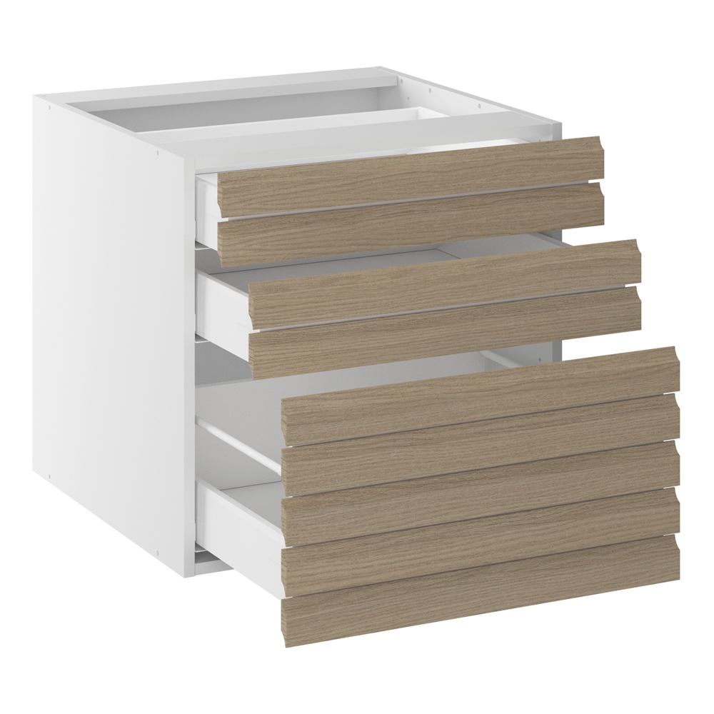 Lækkert lavt design-skuffeskab med fronter i massive træstave i natur-eg. Skabet er velegnet, hvor der enten bruges en ekstra høj sokkel, eller hvor der ønskes en lavere bordpladehøjde. Skabet er udstyret med kvalitets-skuffer, der bærer op til 30 kg. pr. skuffe, og der er selvfølgelig både fuldudtræk og softluk på skufferne. Dette design underskab kan for eksempel anvendes som en del af et køkken- eller bryggersmiljø. Overvej at tilkøbe gummimåtter så alt i skuffen står godt fast ved åbning og lukning.