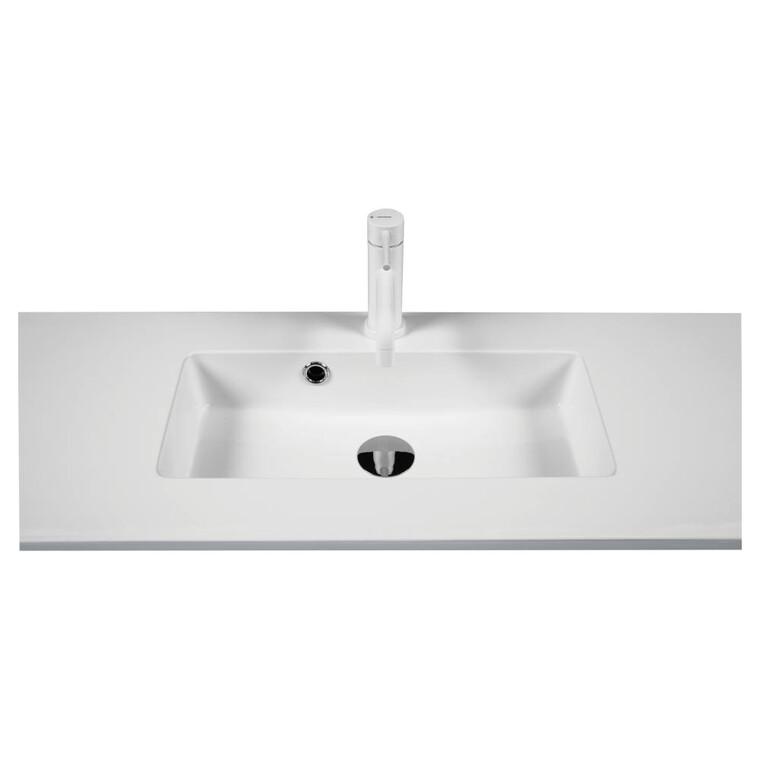 En badbordplade med integreret vask er ikke alene pæn, men også en rigtig praktisk løsning. Her er der ikke fare for at vandet kan løbe mellem bordpladen og vasken ned i skabet, og hele bordpladen kan tåle at komme i kontakt med vand. En helstøbt bordplade med vask som denne i hvid mat marmor er nem at rengøre og kræver ikke vedligehold udover normal rengøring.