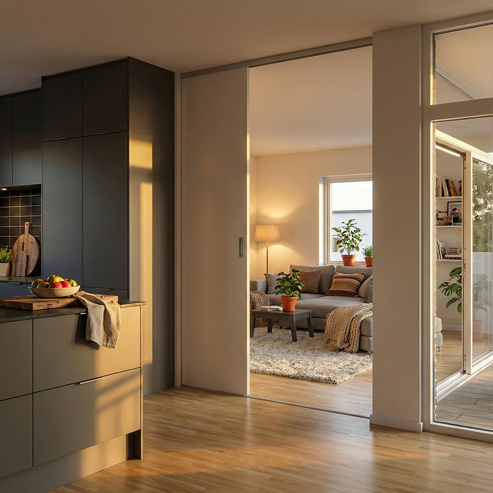 4 skydelåger fra bredde 197 - 801 cm. Prisen er inklusiv skinnesæt og beslagskasse.