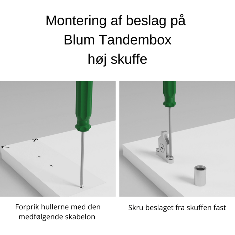 Skuffefronten leveres uboret, så den kan bruges til flere skuffetyper og topskabe. Vi vejleder i Blum Tandembox, som er de eneste skuffer, vi har i vores sortiment. Har du en anden type skuffe, skal du selv finde en skabelon eller selv lave én efter den gamle skuffefront.