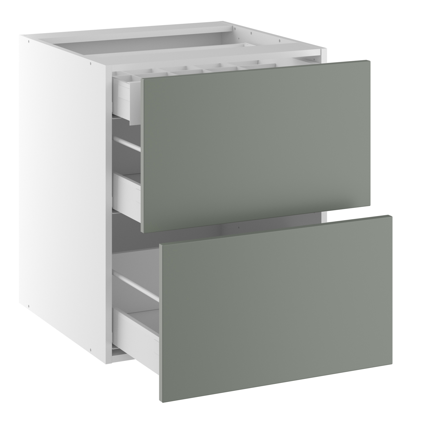 Gennemtænkt skuffemodul med god plads, samt plads til for eksempel bestikbakke i den øverste lave skuffe, der er placeret indvendig bag den store skuffe. Skuffemodulet er udstyret med gode kvalitetsskuffer, der kan bære op til 30 kg. pr. skuffe, og der er selvfølgelig både fuldudtræk og softluk på skufferne. Underskabet kan for eksempel bruges i et køkkenmiljø, hvor du kan opbevare de lidt højere køkkenting og kolonialprodukter. Vi anbefaler at du tilkøber skuffemåtter.