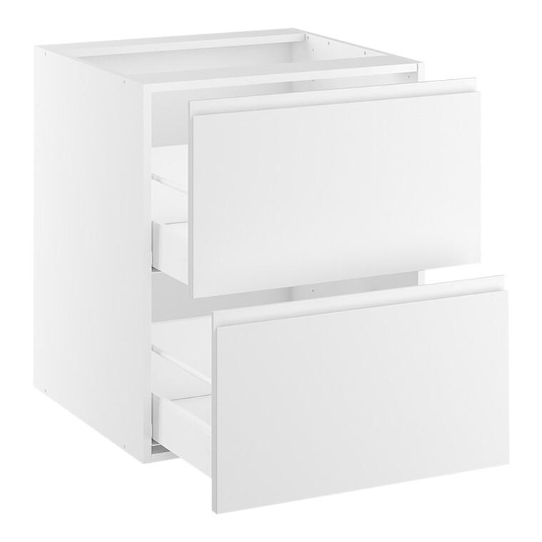Super praktisk skuffeskab med god plads, også til de lidt højere køkkenting og kolonialprodukter. Underskabet er udstyret med kvalitetsskuffer, der bærer op til 30 kg. pr. skuffe, og der er selvfølgelig både fuldudtræk og softluk på skufferne, der kommer fra det velkendte kvalitetsbrand Blum. Overvej at tilkøbe gummimåtter til skuffebunden, så alt i skuffen står godt fast, når du bruger skufferne.