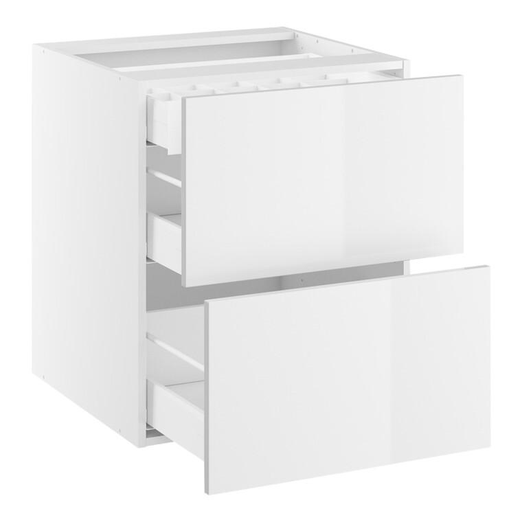 Gennemtænkt skuffemodul med god plads, samt plads til for eksempel bestikbakke i den øverste lave skuffe, der er placeret indvendig bag den store skuffe. Skuffemodulet er udstyret med gode kvalitetsskuffer, der kan bære op til 30 kg. pr. skuffe, og der er selvfølgelig både fuldudtræk og softluk på skufferne. Underskabet kan for eksempel bruges i et køkkenmiljø, hvor du kan opbevare de lidt højere køkkenting og kolonialprodukter. Vi anbefaler at du tilkøber skuffemåtter.