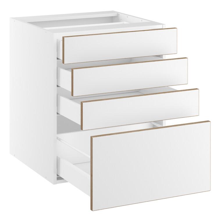 Smart og praktisk skuffeskab med plads til alt det vigtige i din køkkenskabs-indretning. Der er både plads til de lidt højere køkkenting i den nederste skuffe, samt plads til kolonialvarer og bestik med mere i de øvrige 3 skuffer. Med fire skuffer er der masser af plads. Skabet er selvfølgelig udstyret med vores kvalitets-skuffer, der bærer op til 30 kg. pr. skuffe, og der er selvfølgelig fuldudtræk og softluk på skufferne. Overvej at tilkøbe indretningsdele og bestikindsatser eller måske gummimåtter så alt i skuffen står godt fast ved åbning og lukning.