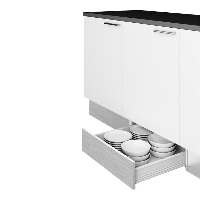 Vores sokkelskuffer leveres med fuldudtræk så du kan trække skuffen helt ud til skuffens bagkant, og se hele indholdet i skuffen. Skufferne har også soft-close så de glider lydløst i, når du lukker dem.