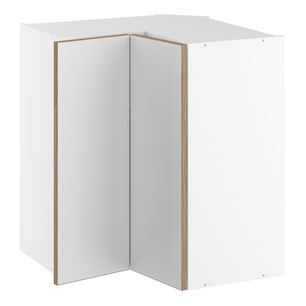 Vinkeloverskab til montering i hjørnet, med 2 låger. Skabet leveres med flytbare hylder og indbygget ophæng og kan sagtens hænge alene, men monteres ofte i sammenhæng med nogen flere skabe.